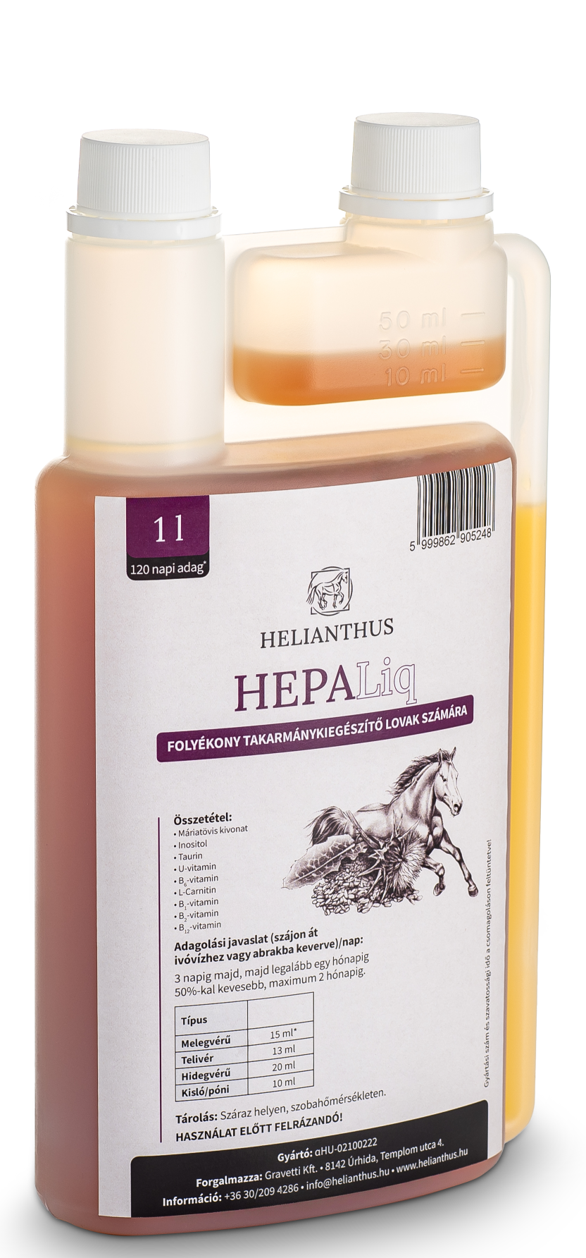A HepaLiq egy folyékony kiegészítő lovak számára, amely segít a máj működésének optimalizálásában, a sejtek anyagcseréjének javításában, valamint az immunrendszer optimális műküdésében. A máj nagy igénybevételnek van kitéve különösen gyógyszeres kezelések, féreghajtás, vagy krónikusan fennálló gyulladás esetén, de a takarmányban vagy a környezetben megtalálható toxinok is megterhelik a működését.