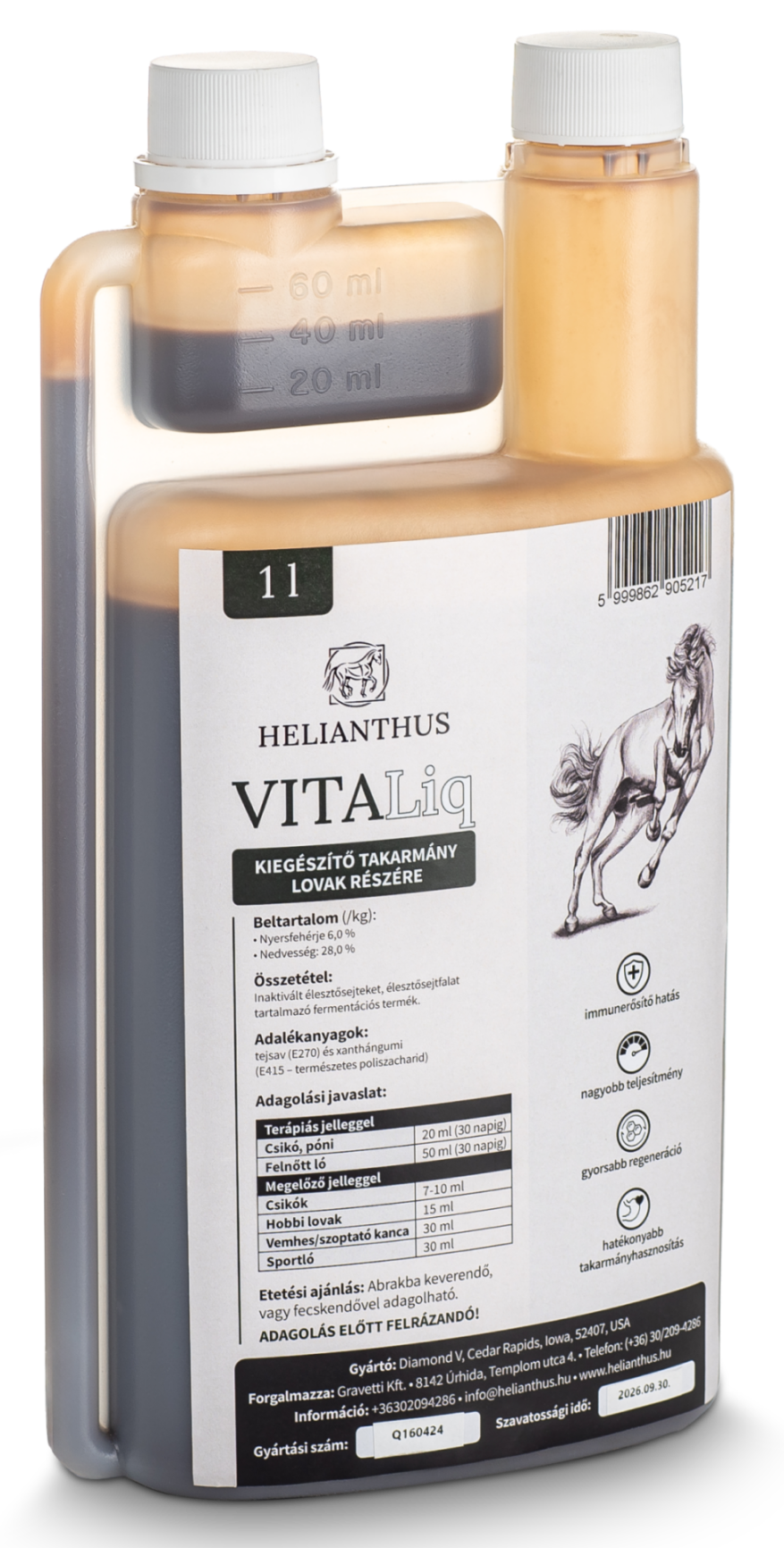 A VitaLiq folyékony, fermentált takarmánykiegészítő tejsavval stabilizálva. Egy biofermentációs folyamat eredménye, amely gyakorlatilag bármilyen nemű, korú, fajtájú ló számára segítséget nyújt az emésztőrendszer egészségének megőrzéséhez, a kiegyensúlyozott teljesítményhez a versenysportban, a regenerációhoz, valamint hatékonyan járul hozzá az immunrendszer normál működéséhez.
